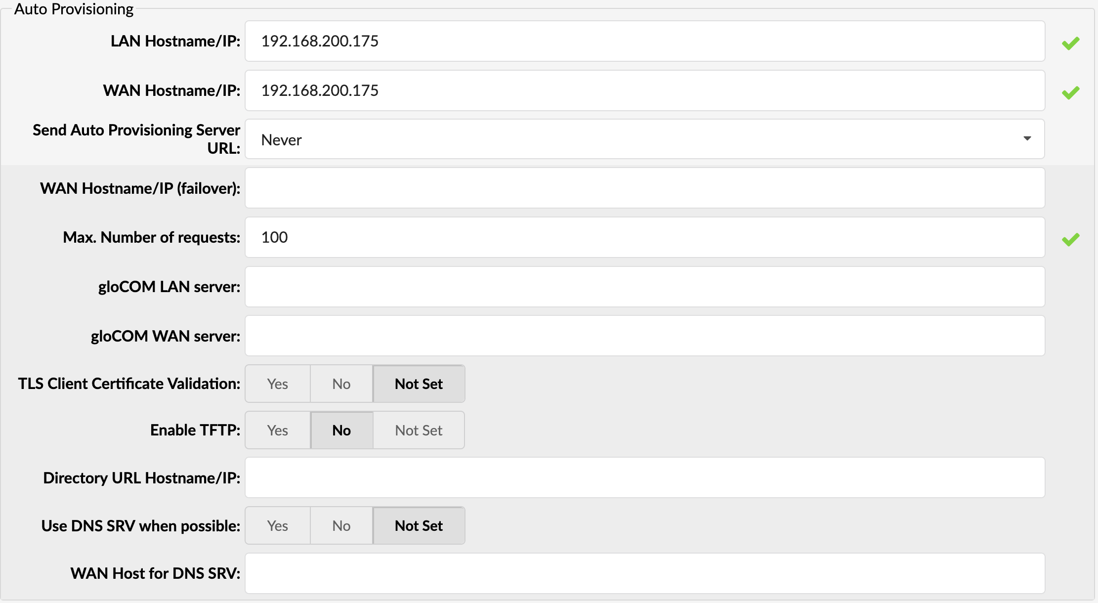 This option allows you to configure a failover address for gloCOM applications, Yealink, and Polycom devices. If the primary server is not available, this address will be used, in which case the devices will connect to the failover server and continue normal operation.