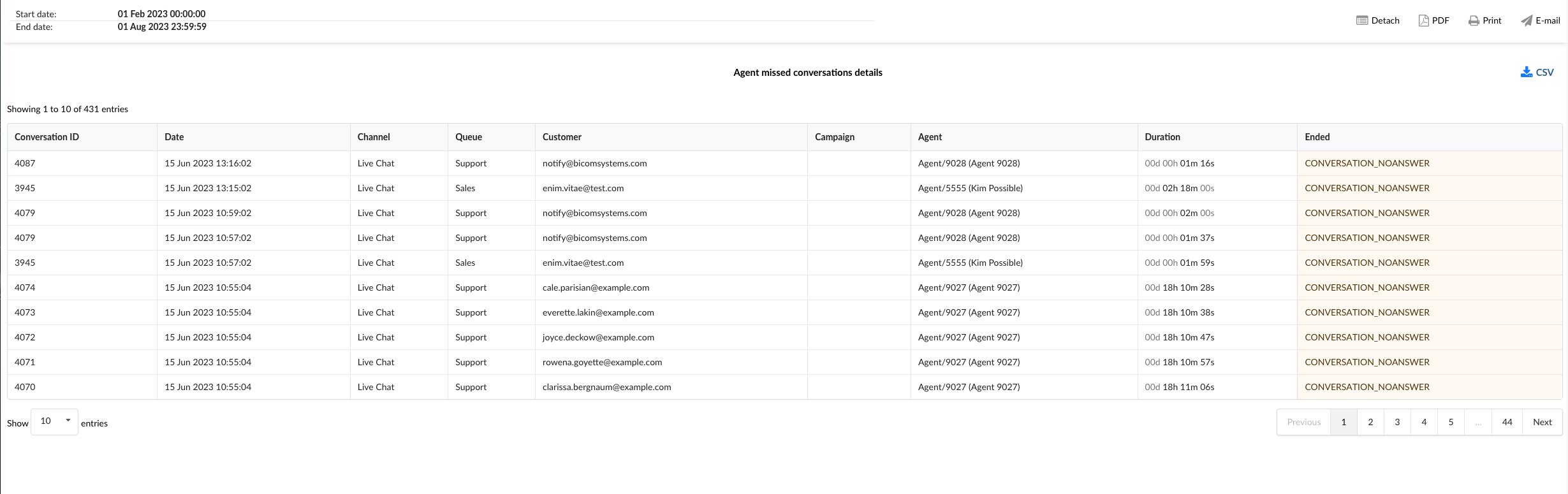In the report breakdown, two icons are linked to the ConversationID field. The first icon permits users to directly view transcripts of selected conversations, while the second enables them to download these transcripts for further review or analysis. These functionalities offer users convenient access to comprehensive records of customer interactions, which supports meticulous monitoring and evaluation of both agent performance and overall customer service quality.