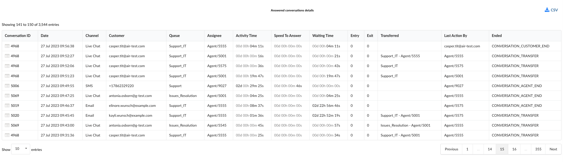 Transferred: This column indicates whether each conversation was transferred to another agent or queue.
