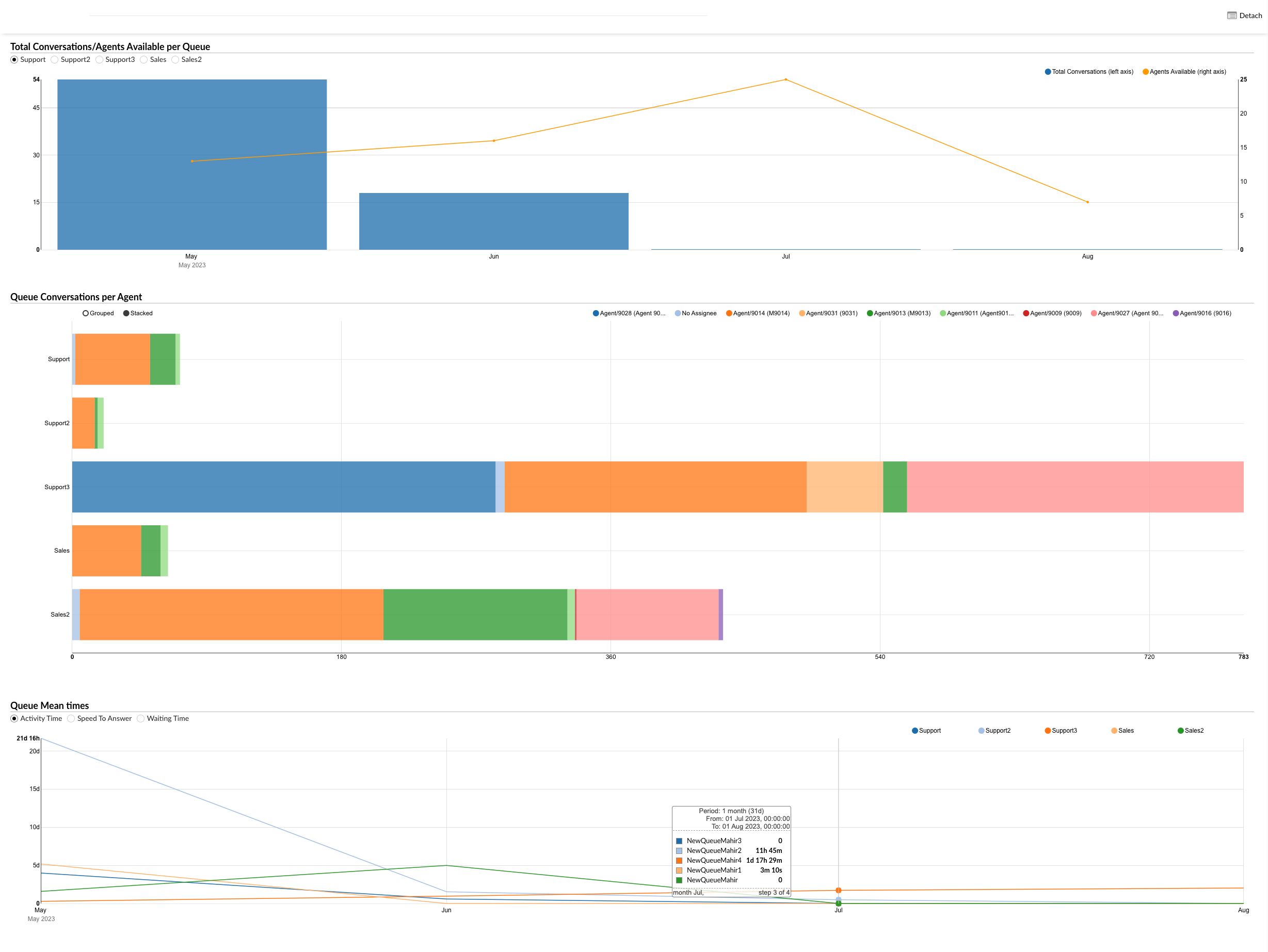 Total Conversations (left axis): This metric is represented by vertical columns. Each column corresponds to the total number of conversations handled in a specific queue. The height of the column corresponds to the number of conversations, as indicated on the left axis.