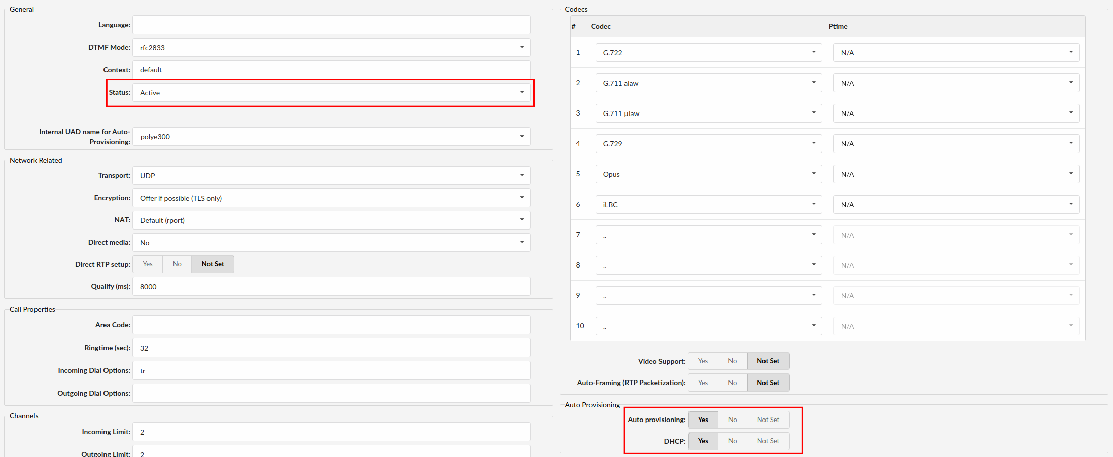 If you want to include some additional UAD configuration for Poly Edge E300, just add fields to User Agent General Auto Provisioning Template in Settings -> UAD -> Poly Edge E300 menu, or add them directly to the Extension in the UAD Auto Provisioning Template section.